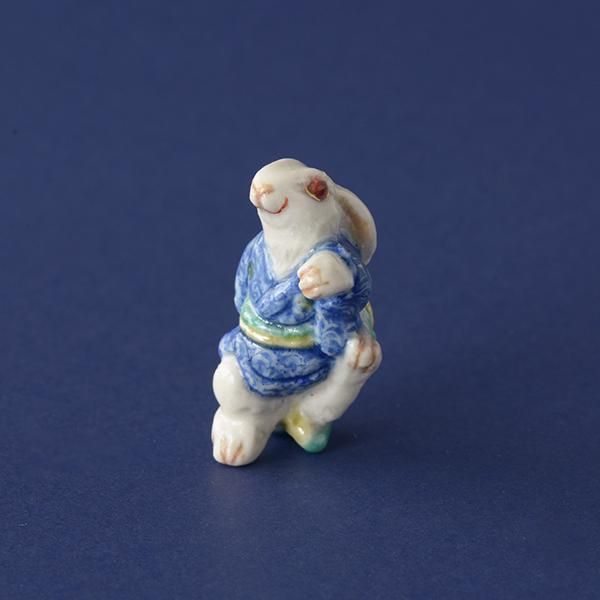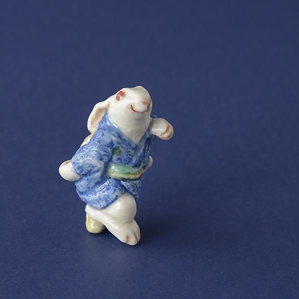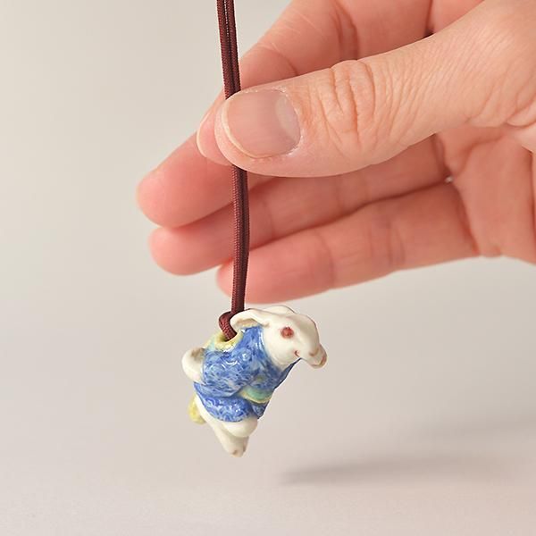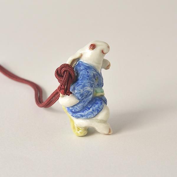 軽やかそうに足をあげ楽しそうに踊るうさぎ。こちらは根付でも提げでもお使いになられます。紐通しが少しちがうので以下の画像を参照してください。