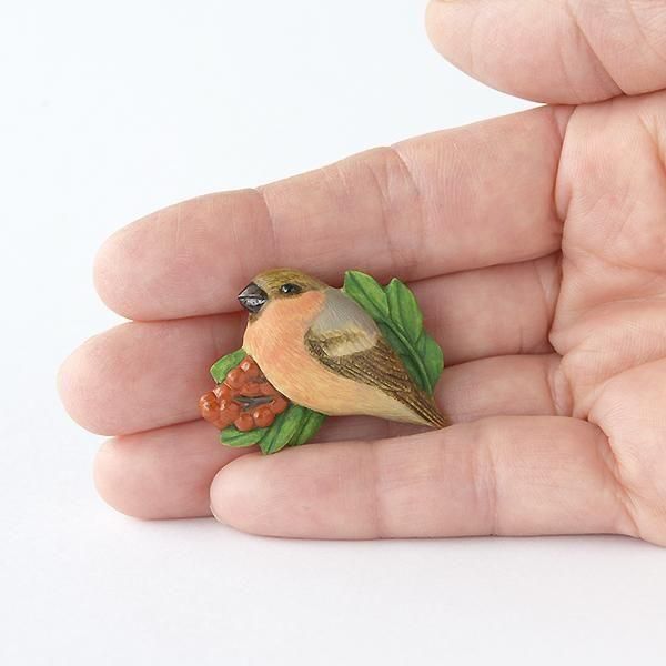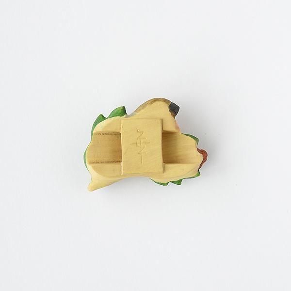 鷽と南天の組み合わせの木彫の帯留です。顔立ちが長久保さんならでは、優しさに溢れています。裏まで丁寧に彫られていて、帯締めも通しやすいです。