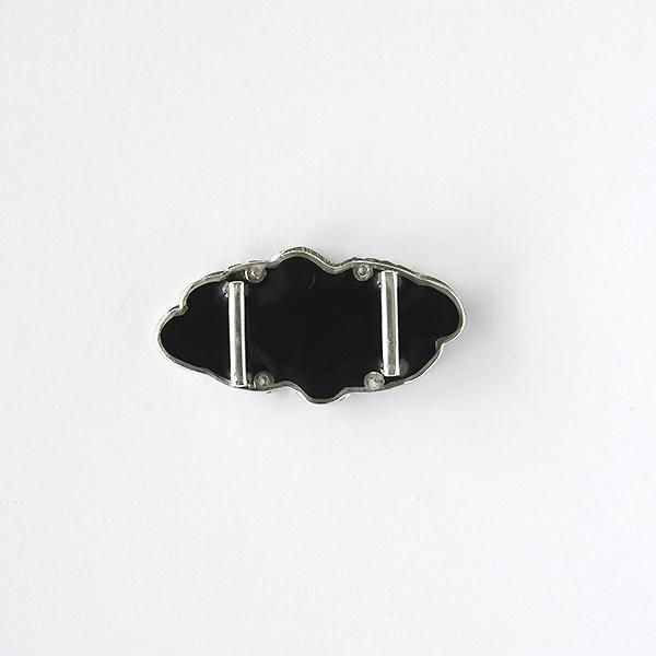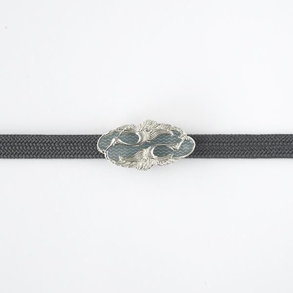 向かいあった鶴が文様化されたような、すっきりとした図の帯留です。背景の色味が鶴を引き立てています。いわゆるニュアンスカラーを意識された色味になっていて、帯にもなじみ合わせやすくなっていると思います。