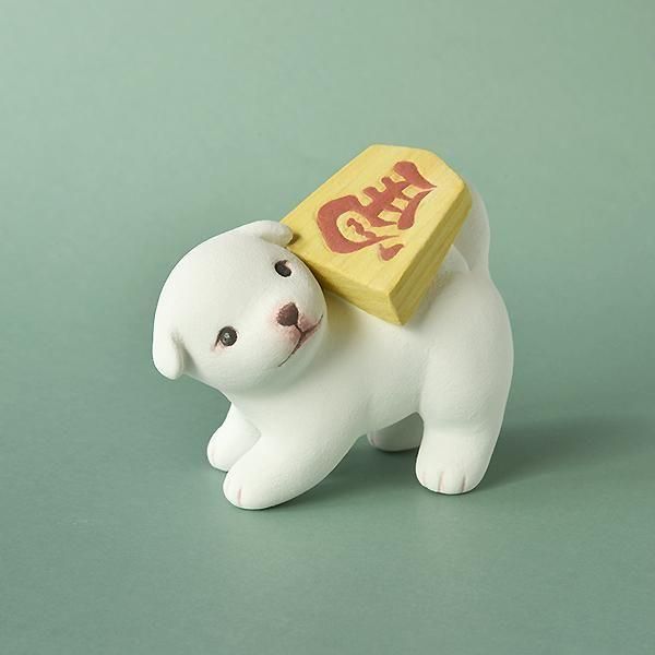 招福の縁起物である左馬の駒を背負っている子犬。まさに午年新年に飾るのにぴったりです。